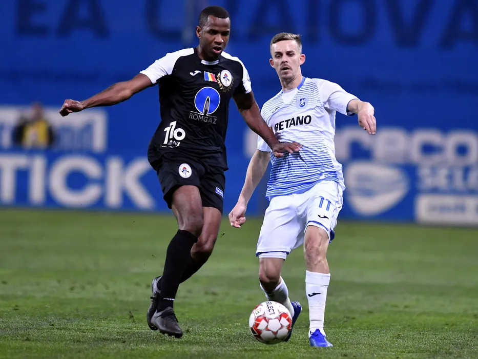 Dumitru Cardoso si Nicusor Bancu in meciul de fotbal dintre Universitatea Craiova si Gaz Metan Medias, contand pentru Liga 1 Casa Pariurilor, disputat pe Stadionul Ion Oblemenco din Craiova, duminica 1 martie 2020. © FOTO:Razvan Pasarica/SPORT PICTURES