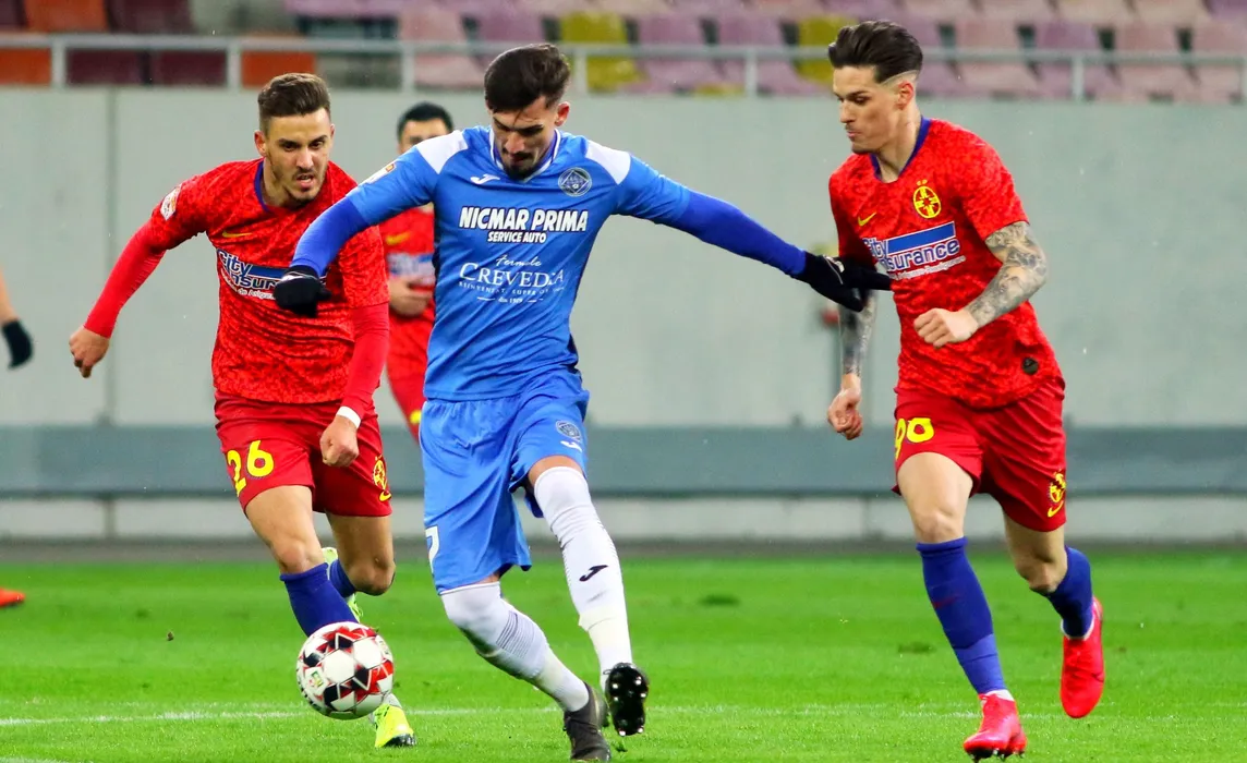 Dennis Man (D), de la FCSB, lupta pentru balon cu Alexandru Albu (S), de la Academica Clinceni, in timpul meciului de fotbal din etapa a XXIV-a a Ligii 1, disputat pe Arena Nationala din Bucuresti luni, 10 februarie 2020. GEORGE FILIP / MEDIAFAX FOTO
