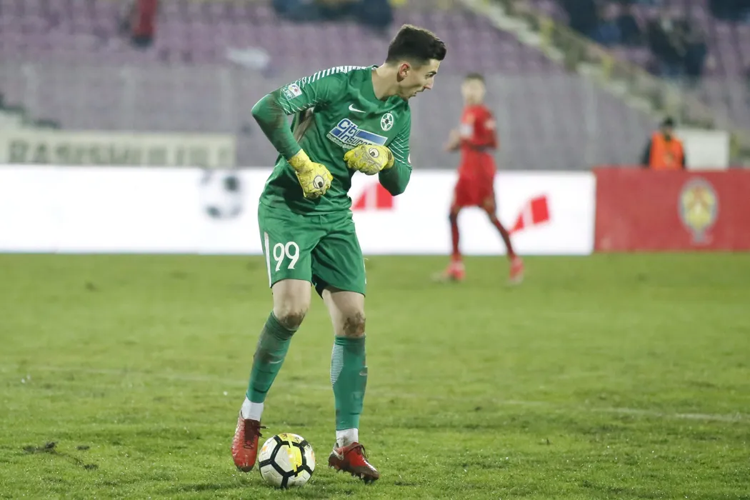 Portarul Andrei Vlad, de la FCSB, suteaza in timpul meciului de fotbal contra echipei ACS Poli Timisoara din optimile de finala ale Cupei Romaniei, disputat pe stadionul Dan Paltinisanu din Timisoara, joi, 30 noiembrie 2017. EMANUEL TITUS ILIESI / MEDIAFAX FOTO