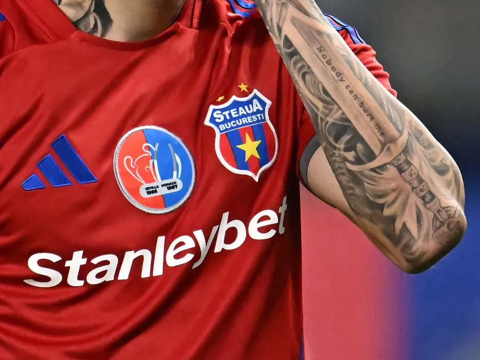 Amanunt vestimentar cu trimitere la finala Cupei Campionilor Europeni din 1986 de la Sevilla si Supercupa Europei de la Monte Carlo din 1987 afisat pe pe tricoul lui Adrian Ilie purtat in meciul de fotbal dintre Steaua Bucuresti si Chindia Targoviste, contand pentru Liga a-2-a Casa Pariurilor, desfasurat pe Stadionul Steaua-Ghencea din Bucuresti, marti 26 noiembrie 2024. © FOTO:Razvan Pasarica/SPORT PICTURES