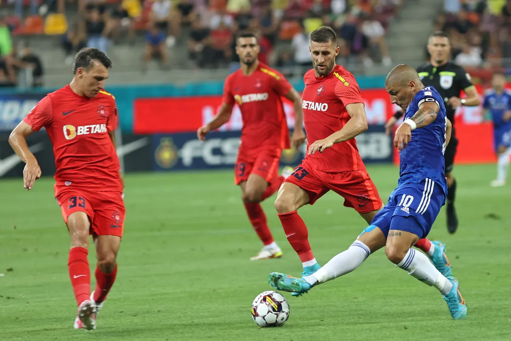 Juan Bauza, Ovidiu Popescu si Risto Radunovic in meciul de fotbal dintre FCSB si U Craiova 1948, contand pentru SuperLiga, desfasurat pe Arena Nationala din Bucuresti, duminica 31 iulie 2022. © FOTO:Gheorghe Fluster/SPORT PICTURES