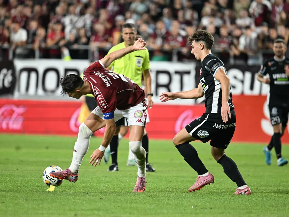 Mihai Alexandru Dobre si Kevin Andrei Ciubotaru in meciul de fotbal dintre Rapid Bucuresti si FC Hermannstadt, din cadrul Superligii Superbet, desfasurat pe Superbet Arena-Giulesti din Bucuresti, duminica 21 septembrie 2025. © FOTO:Razvan Pasarica/SPORT PICTURES