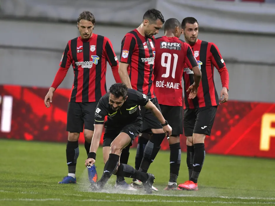 Arbitrul central Sebastian Coltescu alaturi de Momcilo Raspopovic, Valerica Marius Gaman si Sulejman Krpic in meciul de fotbal dintre Astra Giurgiu si Dinamo Bucuresti, contand pentru semifinala tur a Cupei Romaniei, desfasurat fara spectatori pe Stadionul Marin Anastasovici din Giurgiu, marti 13 aprilie 2021. © FOTO:Razvan Pasarica/SPORT PICTURES