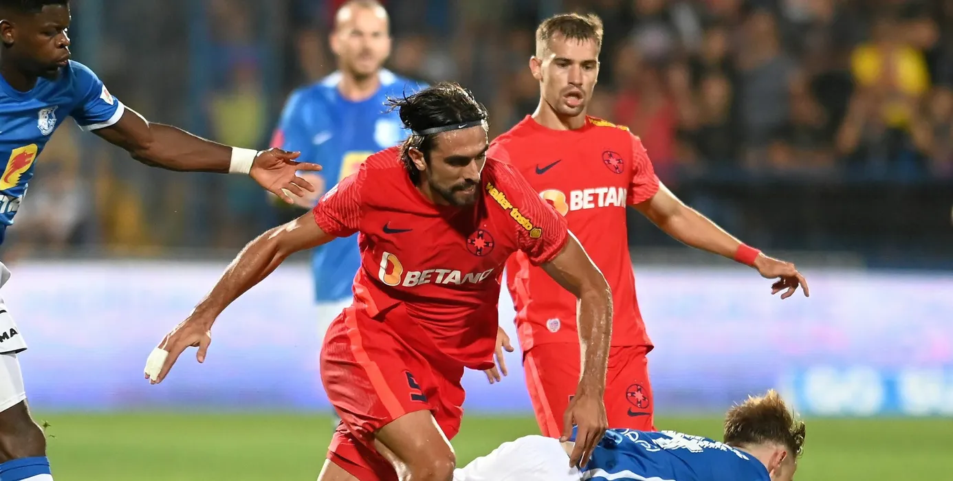 Enagnon David Kiki, Andrea Compagno, Constantin Grameni si Darius Dumitru Olaru in meciul de fotbal dintre Farul Constanta si FCSB, contand pentru Superliga Superbet, desfasurat pe Stadionul central al Academiei Gheorghe Hagi din Ovidiu, miercuri 31 august 2022. © FOTO:Razvan Pasarica/SPORT PICTURES