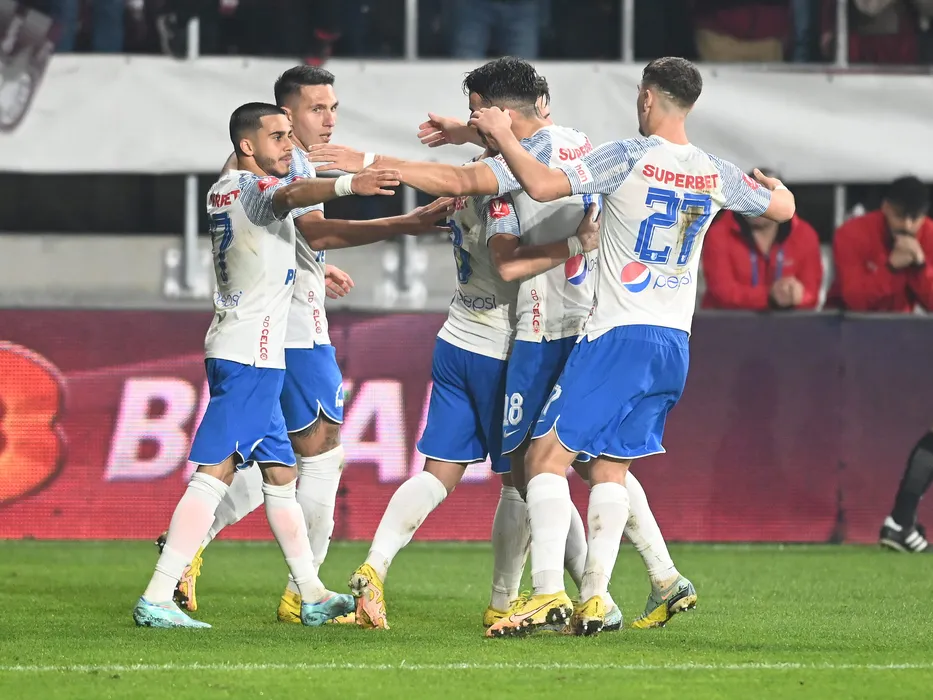 Bucurie a fotbalistilor constanteni Enes Sali, Robert Marian Moldoveanu si Andrei Viorel Artean dupa un gol marcat in meciul de fotbal dintre Rapid Bucuresti si Farul Constanta, contand pentru Cupa Romaniei, desfasurat pe Stadionul Rapid Giulesti din Bucuresti, miercuri 9 noiembrie 2022. © FOTO:Razvan Pasarica/SPORT PICTURES