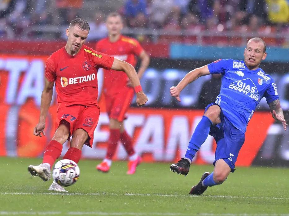 Darius Dumitru Olaru si Modestas Vorobjovas in meciul de fotbal dintre FCSB si Chindia Targoviste, contand pentru Superliga Superbet, desfasurat pe Arena Nationala din Bucuresti, duminica 14 august 2022. © FOTO:Razvan Pasarica/SPORT PICTURES