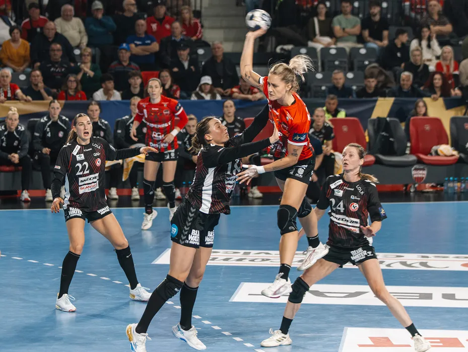 Angela Stefania Stoica si Sanna Charlotte Solberg-Isaksen, Olivia Linnéa Josephine Löfqvist, Line Haugsted in meciul de handbal feminin dintre Gloria Bistrita și Team Esbjerg, contand pentru Liga Campionilor, desfasurat in Sala Polivalenta Teraplast Arena din Bistrita, sambata 25 octombrie 2025. © FOTO:Bianca Salagean/SPORT PICTURES