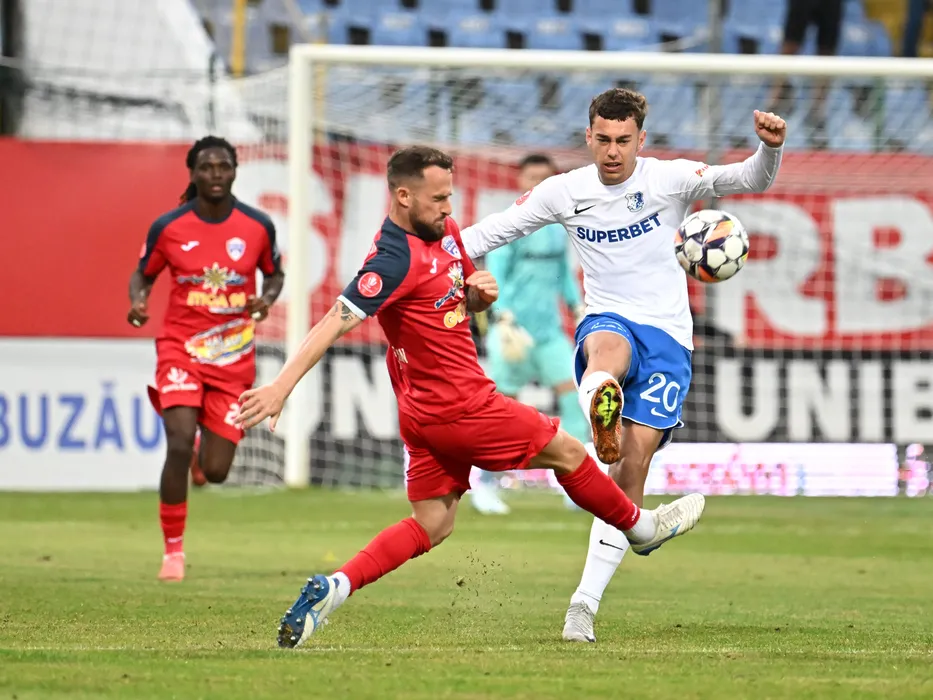 Diego Gustavo Ferraresso Scheda si Eduard Gabriel Radaslavescu in meciul de fotbal dintre Gloria Buzau si Farul Constanta, contand pentru Superliga Superbet, desfasurat pe Stadionul Municipal din Buzau, duminica 29 septembrie 2024. © FOTO:Razvan Pasarica/SPORT PICTURES