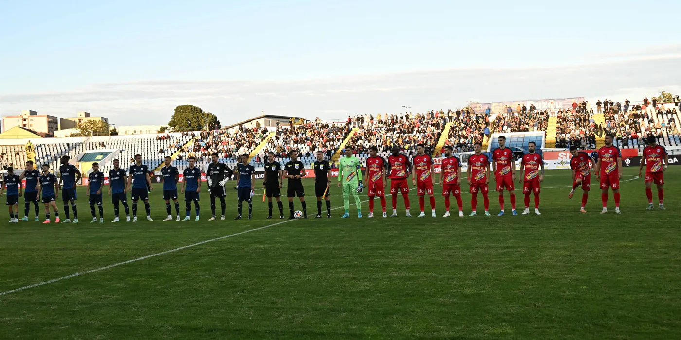 Fotbalistii celor doua echipe alaturi de brigada de arbitrii la startul meciului de fotbal dintre Gloria Buzau si Otelul Galati, contand pentru Superliga Superbet, desfasurat pe Stadionul Municipal din Buzau, sambata 14 septembrie 2024. © FOTO:Razvan Pasarica/SPORT PICTURES