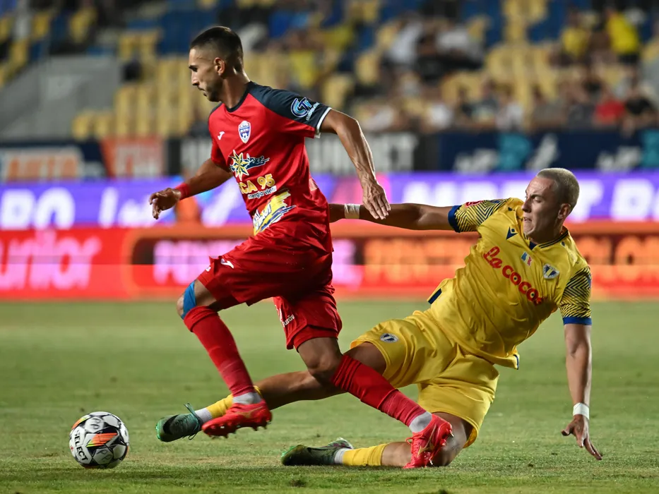 Vlad Iuliu Prejmerean si Mihai Alexandru Isfan in meciul de fotbal dintre Petrolul Ploiesti si Gloria Buzau, din cadrul Superligii Superbet, desfasurat pe Stadionul Ilie Oana din Ploiesti, luni 15 iulie 2024. © FOTO:Razvan Pasarica/SPORT PICTURES
