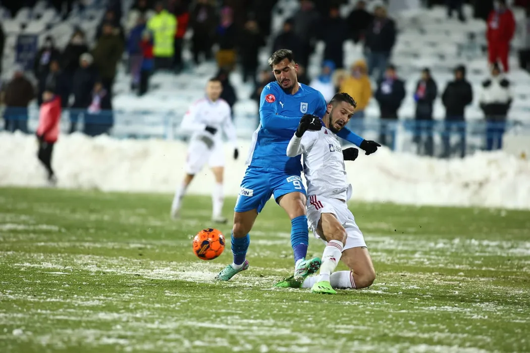 Andrei Virgil Ivan și Dragan Lovric în meciul de fotbal dintre ACS SUPORTER CLUB OTELUL GALATI si UNIVERSITATEA CRAIOVA, contând pentru Superliga Superbet, desfășurat pe Stadionul Oțelul din Galați, duminică 26 noiembrie 2023. © FOTO: Sorin PANĂ/SPORT PICTURES