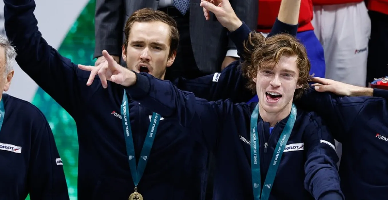 December 5, 2021, MADRID, MADRID, SPAIN: Daniil Medvedev, Andrey Rublev, Aslan Karastev of Russia celebrate the victory during the Davis Cup Finals 2021, Final, tennis match played between Russia and Croatia at Madrid Arena pabilion on December 04, 2021, in Madrid, Spain.,Image: 646557500, License: Rights-managed, Restrictions: , Model Release: no, Credit line: Profimedia