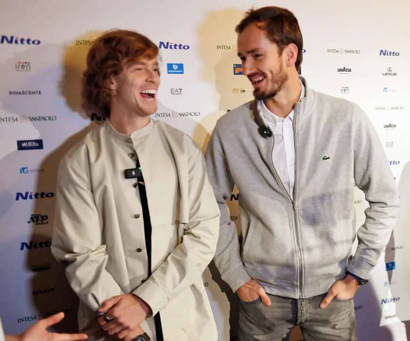 The annual final men's tournament ATP Finals 2023 in Turin. Press conferences of players before the start of the tournament. Russian tennis players Andrei Rublev (left) and Daniil Medvedev (right) during a press conference.