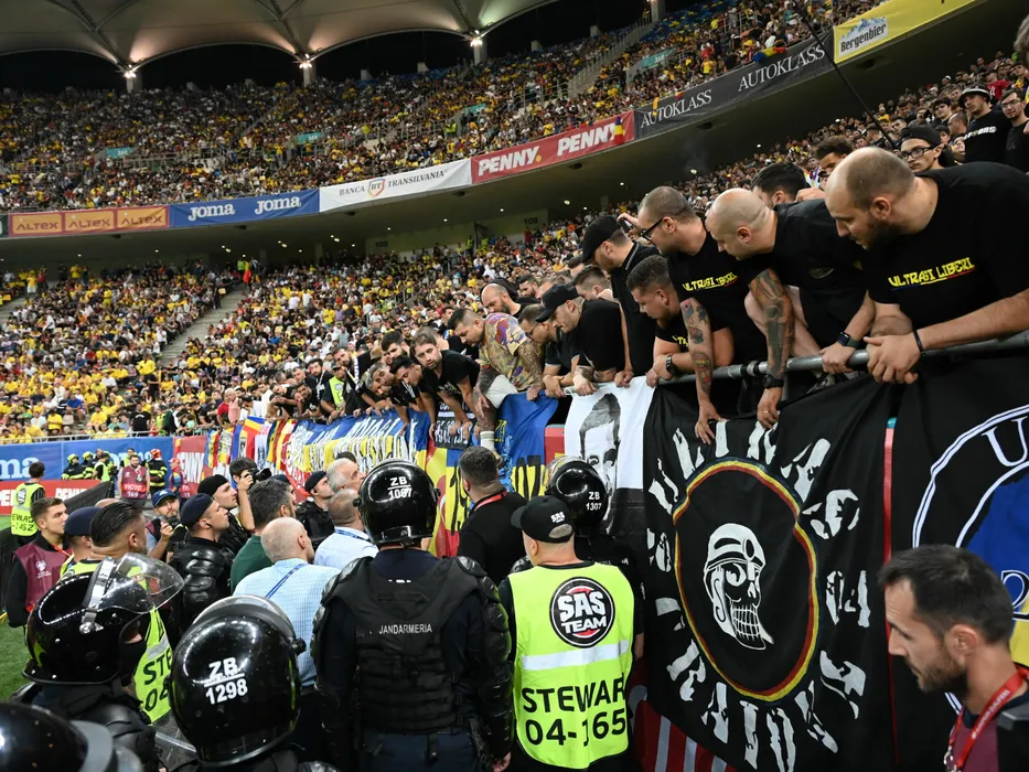 Fortele de ordine si securitate discuta cu reprezentantii "Uniti sub tricolor" la meciul de fotbal dintre Romania si Kosovo, din cadrul preliminariilor Campionatului European 2024, desfasurat pe Arena Nationala, marti 12 septembrie 2023. © FOTO:Razvan Pasarica/SPORT PICTURES