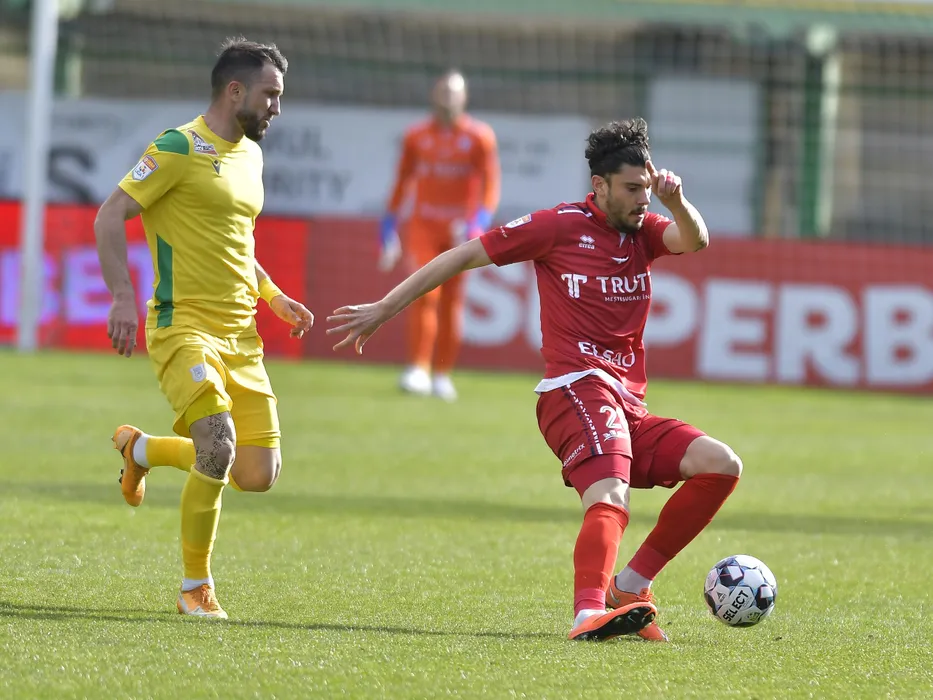 Gheorghe Bogdan Rusu si Mihai Alexandru Roman in meciul de fotbal dintre CS Mioveni si FC Botosani, contand pentru Play-out-ul Ligii 1 Casa Pariurilor, desfasurat pe Stadionul Orasenesc din Mioveni, luni 2 mai 2022. © FOTO:Razvan Pasarica/SPORT PICTURES