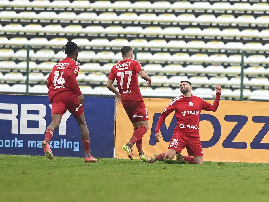 Fotbalistii botoseneni se bucura dupa un gol marcat de catre Arpad Sebastian Mailat in meciul de fotbal dintre FC Arges si FC Botosani, contand pentru Superliga Superbet, desfasurat pe Stadionul Nicolae Dobrin din Pitesti, duminica 29 ianuarie 2023. © FOTO:Razvan Pasarica/SPORT PICTURES