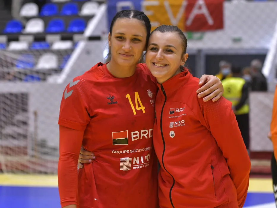 Handbalistele Romaniei Bianca Maria Bazaliu si Yuliya Dumanska pozeaza dupa meciul de handbal feminin dintre Romania si Insulele Feroe, contand pentru Preliminariile CE 2022, desfasurat in Sala Sporturilor din Mioveni, miercuri 6 octombrie 2021. © FOTO:Razvan Pasarica/SPORT PICTURES