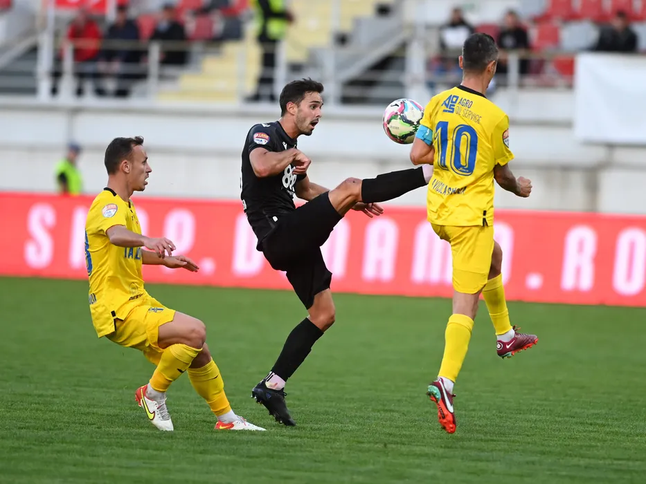 Antonio Cruceru, Gorka Larrucea si Constantin Toma in meciul de fotbal dintre Dinamo Bucuresti si Unirea Slobozia, contand pentru Liga 2 Casa Pariurilor, desfasurat pe Stadionul Marin Anastasovici din Giurgiu, marti 4 octombrie 2022. © FOTO:Razvan Pasarica/SPORT PICTURES