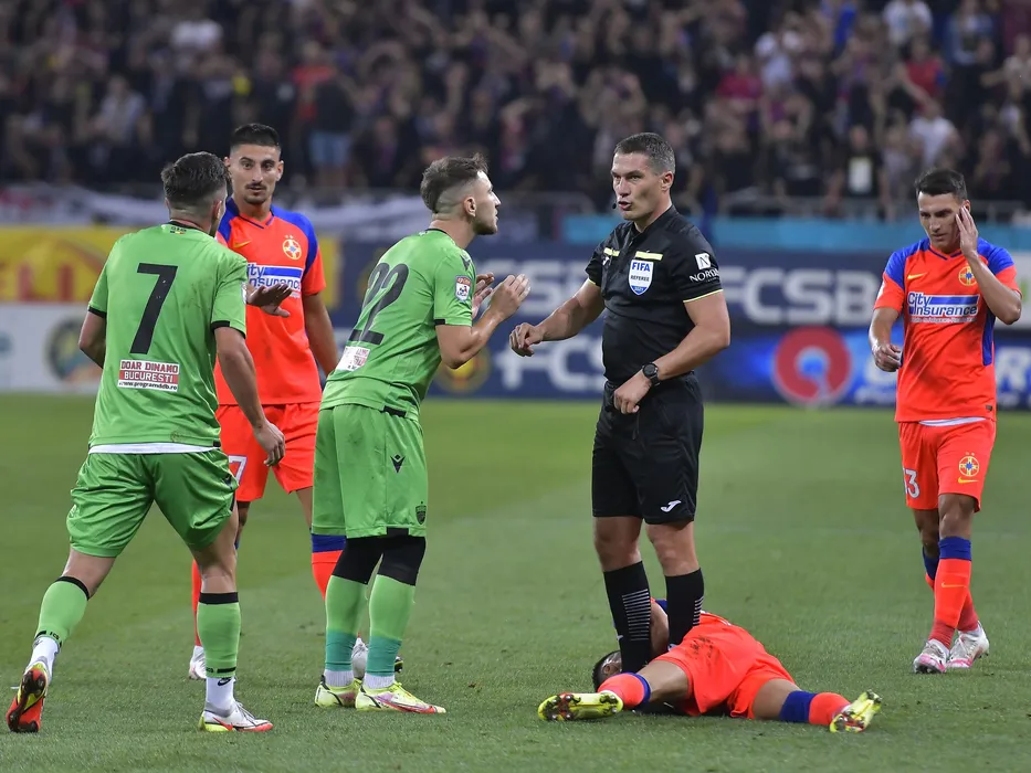 Arbitrul central Istvan Kovacs discuta cu Deian Cristian Sorescu in meciul de fotbal dintre FCSB si Dinamo Bucuresti, contand pentru Liga 1 Casa Pariurilor, desfasurat pe Arena Nationala din Bucuresti, duminica 12 septembrie 2021. © FOTO:Razvan Pasarica/SPORT PICTURES