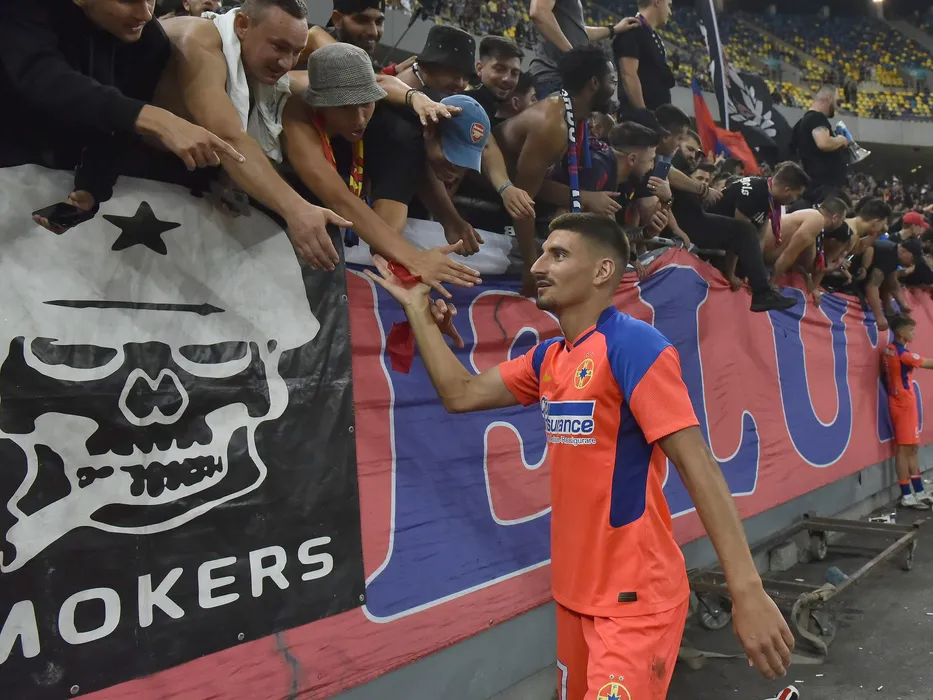 Iulian Cristea dă mâna cu sporterii vicecampioanei României la finalul meciului FCSB - Dinamo.