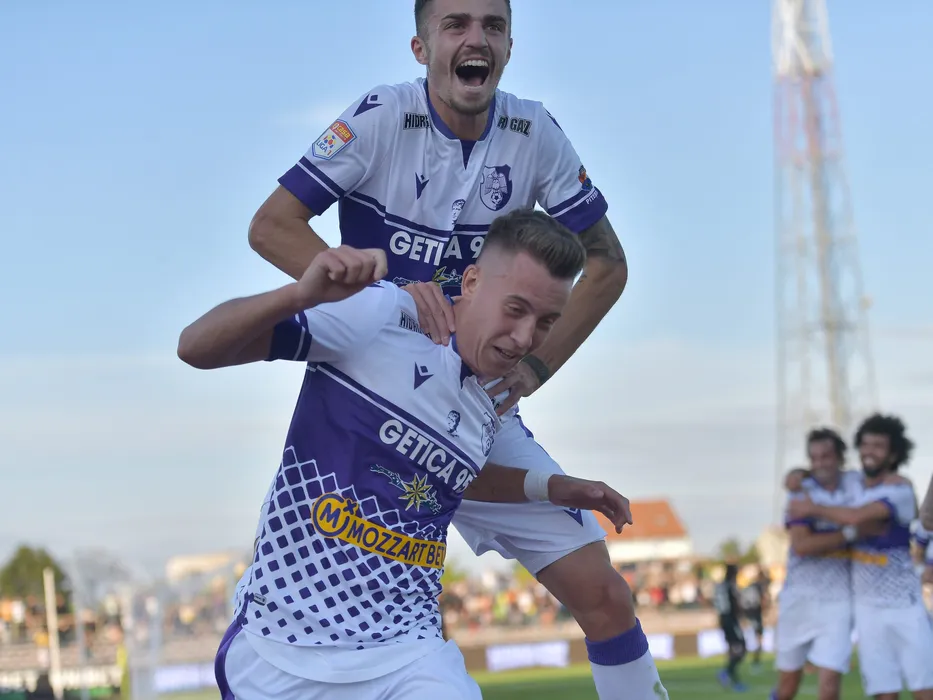 Grigore Ioan Turda si Mihai Alexandru Isfan se bucura dupa un gol marcat in meciul de fotbal dintre FC Arges si FC U Craiova, contand pentru Liga 1 Casa Pariurilor, desfasurat pe Stadionul Nicolae Dobrin din Pitesti, sambata 11 septembrie 2021. © FOTO:Razvan Pasarica/SPORT PICTURES