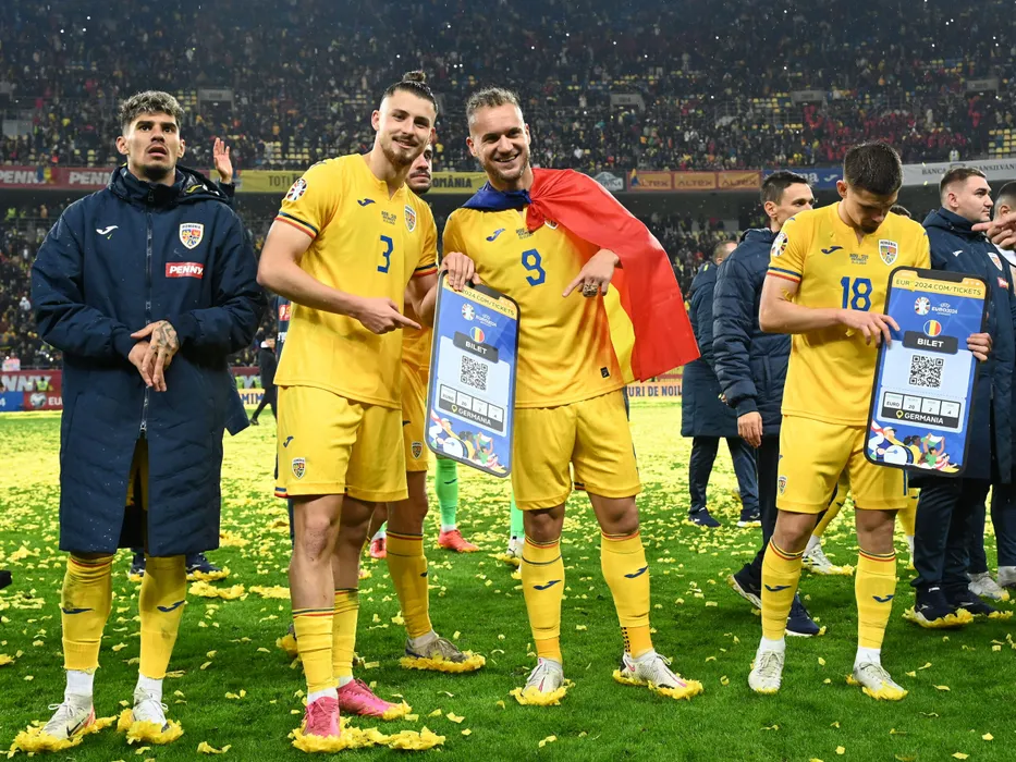 Florinel Coman, Radu Dragusin, George Puscas si Răzvan Marin pozeaza dupa calificarea obtinuta in urma meciului de fotbal dintre Romania si Elvetia, din cadrul preliminariilor Campionatului European 2024, desfasurat pe Arena Nationala, marti 21 noiembrie 2023. © FOTO:Razvan Pasarica/SPORT PICTURES