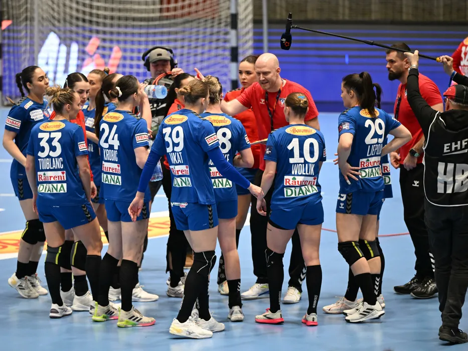 Handbalistele valcene la un timeout alaturi de antrenorul lor Rasmus Rygard Poulsen in meciul de handbal feminin dintre SCM Ramnicu Valcea si Ikast Handbold, contand pentru EHF European League, desfasurat in sala Traian din Ramnicu Valcea, duminica 19 ianuarie 2025. © FOTO:Razvan Pasarica/SPORT PICTURES