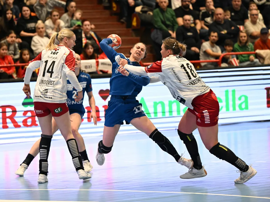 Emma Filippa Lindqvist, Ioana Rebeca Necula si Maria Schmidt Lykkegaard in meciul de handbal feminin dintre SCM Ramnicu Valcea si Ikast Handbold, contand pentru EHF European League, desfasurat in sala Traian din Ramnicu Valcea, duminica 19 ianuarie 2025. © FOTO:Razvan Pasarica/SPORT PICTURES