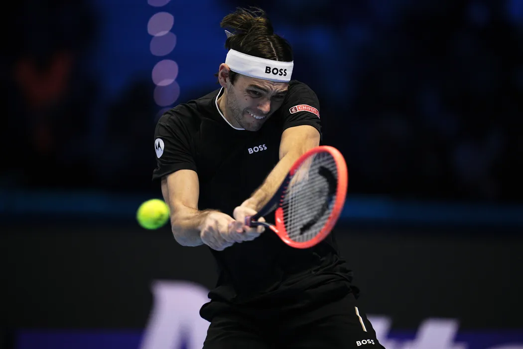 17 November 2024, Italy, Turin: US tennis player Taylor Fritz in action against Italy's Jannik Sinner, during the ATP World Tour Finals Men's Singles tennis match at the Inalpi Arena. Photo: Marco Alpozzi/LaPresse via ZUMA Press/dpa