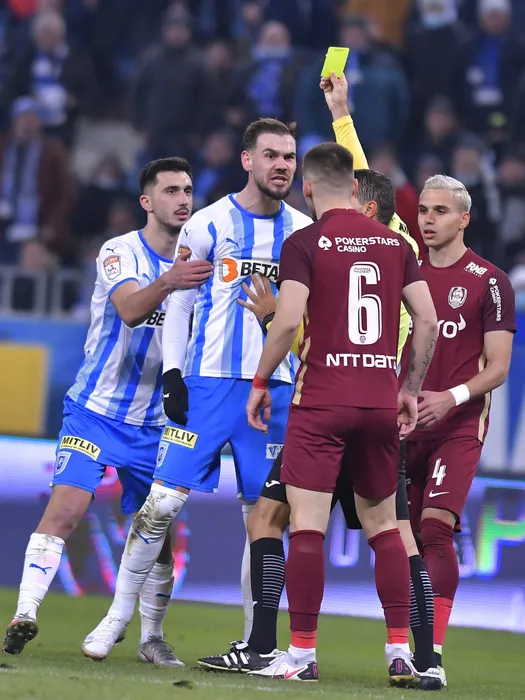 Elvir Koljic primeste un cartonas galben dupa un duel cu Daniel Graovac sub privirile lui Andrei Virgil Ivan si Cristian Marian Manea in meciul de fotbal dintre Universitatea Craiova si CFR Cluj, contand pentru Liga 1 Casa Pariurilor, desfasurat pe Stadionul Ion Oblemenco din Craiova, sambata 5 februarie 2022. © FOTO:Razvan Pasarica/SPORT PICTURES