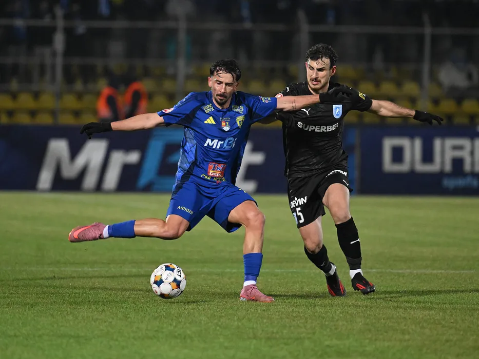Cristian Ioan Ponde si Anzor Mekvabishvili in meciul dintre Unirea Slobozia si Universitatea Craiova, contand pentru Superliga Superbet, desfasurat pe Stadionul 1 Mai din Slobozia, duminica 22 februarie 2026. © FOTO:Razvan Pasarica/SPORT PICTURES
