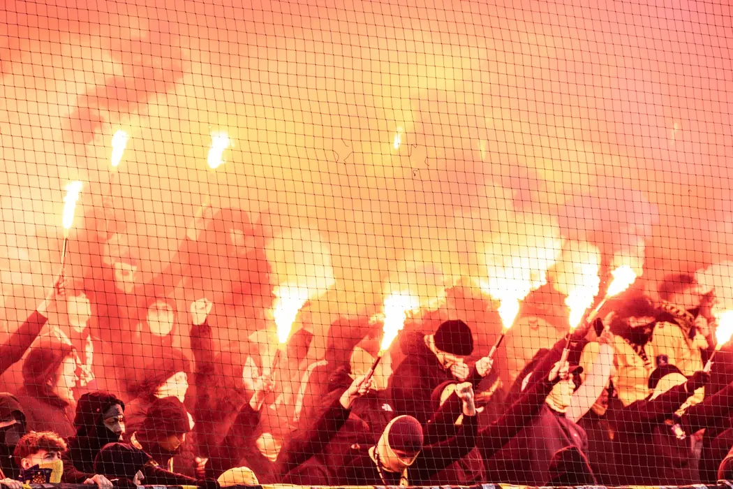 Pyrotechnic and smoke from fans during the Danish 3F Superliga match between FC Copenhagen and Brondby IF at Parken on April 1, 2024 in Copenhagen, Denmark Copenhagen Parken Stadium Denmark Copyright: xKristianxTuxenxLadegaardxBergx 2E6A6952,Image: 862570862, License: Rights-managed, Restrictions: Credit images as "Profimedia/ IMAGO", Model Release: no