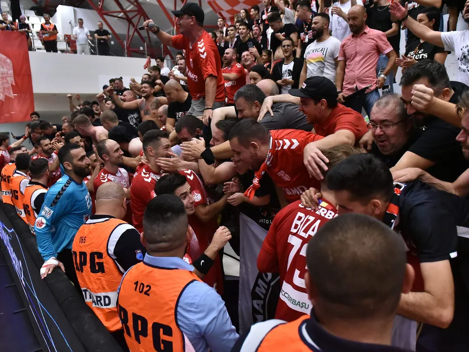 Handbalistii dinamovisti Saeid Heidarirad, Valentin Ghionea si Robert Mihai Militaru se bucura alaturi de suporteri dupa meciul de handbal masculin dintre Dinamo Bucuresti si Lomza Vive Kielce, contand pentru Liga Campionilor, desfasurat in Sala Dinamo din Bucuresti, joi 16 septembrie 2021. © FOTO:Razvan Pasarica/SPORT PICTURES