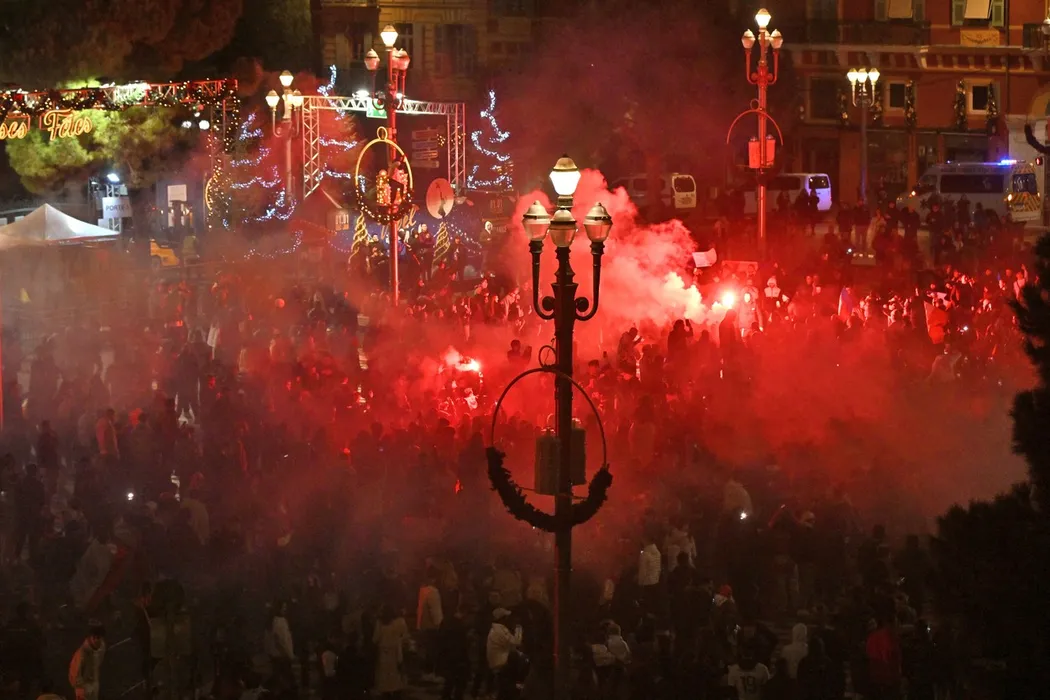 Les supporters de l'équipe de France de Football ont célébré, à Nice, la qualification des Bleus face au Maroc sans incident majeur, le 14 décembre 2022. Annoncée comme une rencontre à haut risque, la municipalité azuréenne n'a pas eu à subir des forts débordements. A l'issue de la rencontre, à Nice, les effectifs locaux de la police nationale appuyés par les CRS et 50 policiers municipaux en renfort ont repoussé plusieurs groupes d'individus cherchant à en découdre. Les policiers ont fait usage de gaz lacrymogène et de tir de lanceurs de balles de défense pour disperser ces groupes avenue Jean Medecin où quelques containers à ordures ménagères ont été incendiés. © Bruno Bebert/Bestimage The supporters of the French football team celebrated, in Nice, the qualification of the Blues against Morocco without major incident, on December 14, 2022.,Image: 744744280, License: Rights-managed, Restrictions: , Model Release: no