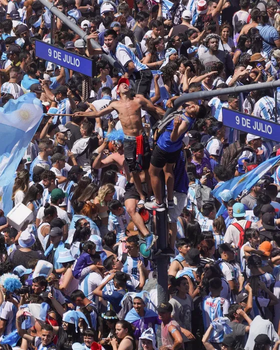 Argentine soccer fans celebrate their team's World Cup victory over France, in Buenos Aires, Argentina, Sunday, Dec. 18, 2022.,Image: 745403345, License: Rights-managed, Restrictions: This content is intended for editorial use only. For other uses, additional clearances may be required., Model Release: no