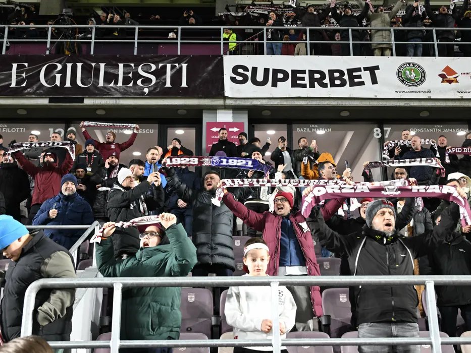 Suporterii rapidisti isi incurajeaza favoritii la meciul de fotbal dintre Rapid Bucuresti si Petrolul Ploiesti, din cadrul Superligii Superbet, desfasurat pe Superbet Arena-Giulesti din Bucuresti, vineri 6 februarie 2026. © FOTO:Razvan Pasarica/SPORT PICTURES