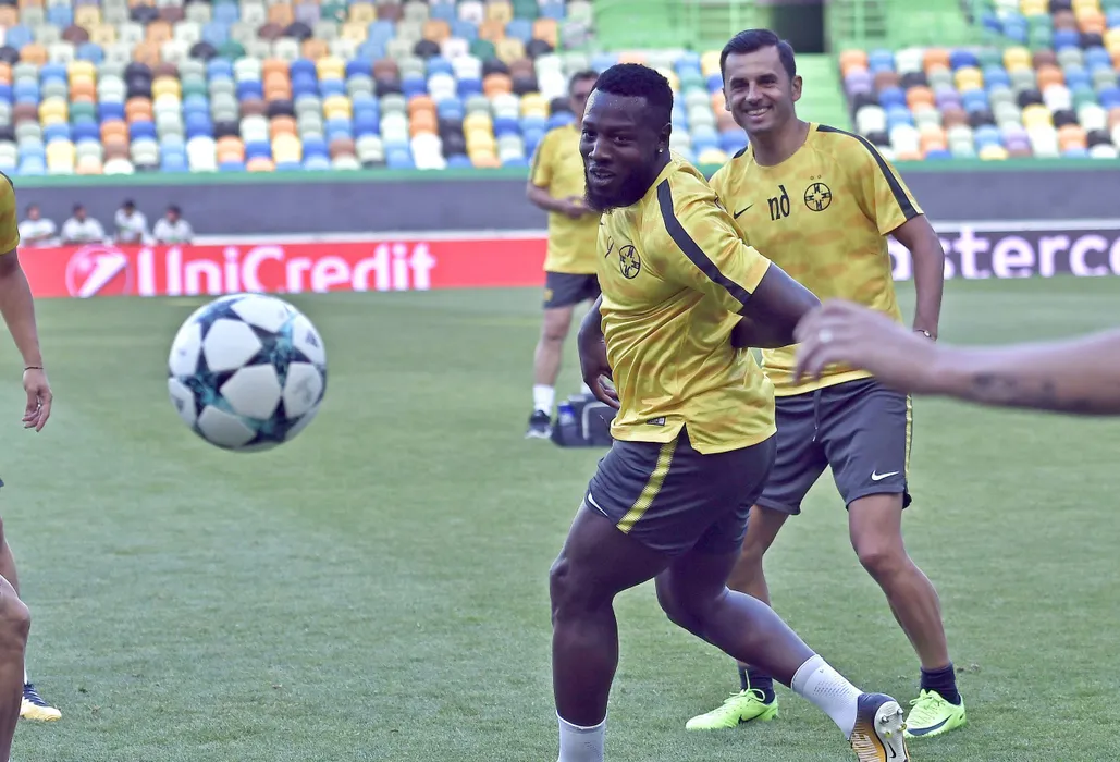 Eddy Harlem Gnohere si Nicolae Dica la antrenamentul oficial de dinaintea meciului de fotbal dintre FC Steaua Bucuresti si Sporting Lisabona, contand pentru playoff-ul Ligii Campionilor, luni 14 august 2017 pe stadionul Jose Alvalade din Lisabona. Razvan Pasarica/SPORT PICTURES