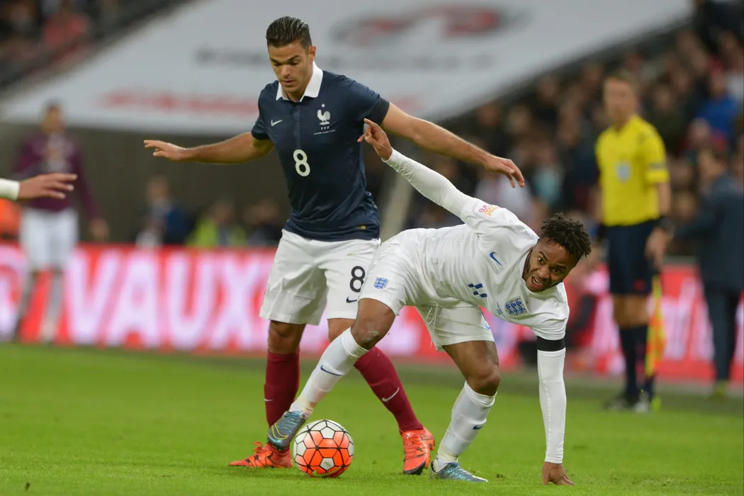 France's Hatem Ben Arfa battling England's Raheem Sterling during the Friendly international soccer match, England vs France at Wembley Stadium in London, UK on November 17th, 2015. England won 2-0. Photo by Henri Szwarc/ABACAPRESS.COM