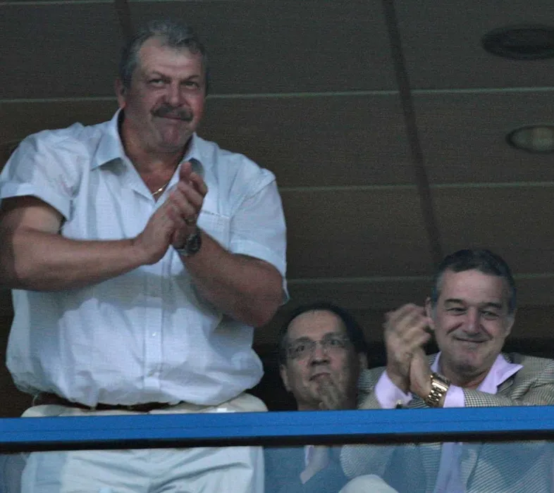 Helmuth Duckadam (S), presedintele eschipei Steaua Bucuresti, si finantatorul Gigi Becali (C), urmaresc meciul cu Victoria Branesti, din cadrul etapei a IV-a a Ligii I la fotbal, luni, 16 august 2010, la Bucuresti. CONSTANTIN VLADESCU / MEDIAFAX FOTO