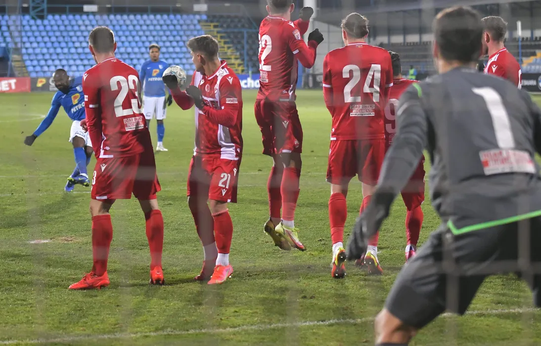 Michael Omoh executa o lovitura libera in meciul amical de fotbal dintre Farul Constanta si Dinamo Bucuresti, desfasurat pe Stadionul central al Academiei Gheorghe Hagi din Ovidiu, sambata 15 ianuarie 2022. © FOTO:Razvan Pasarica/SPORT PICTURES