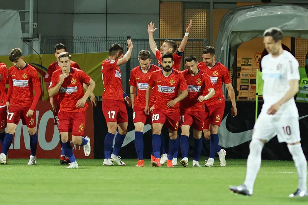 Echipele FCSB (echipament rosu) si CFR Cluj s-au intalnit intr-o partida disputata in etapa cu numarul 5 din play-off-ul Ligii 1 la fotbal, luni 3 mai 2021, in Giurgiu. GEORGE FLUSTER / MEDIAFAX FOTO