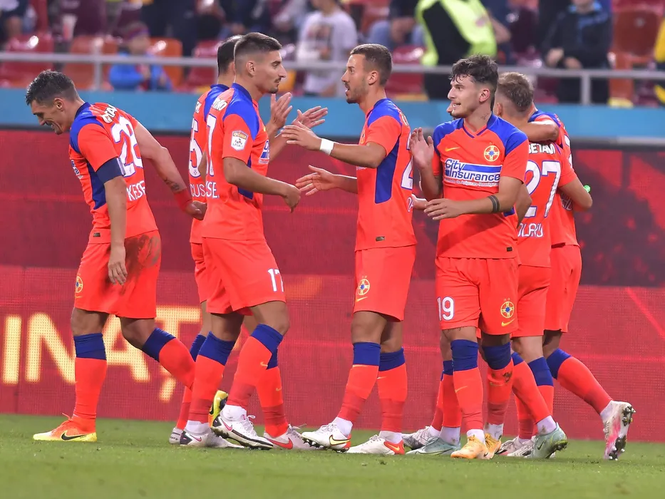 Bucurie a fotbalistilor stelisti dupa un gol marcat cu Iulian Lucian Cristea, Razvan Constantin Oaida si Ianis Ilie Stoica in meciul de fotbal dintre FCSB si Academica Clinceni, contand pentru Liga 1 Casa Pariurilor, desfasurat pe Stadionul Marin Anastasovici din Giurgiu, sambata 25 septembrie 2021. © FOTO:Razvan Pasarica/SPORT PICTURES