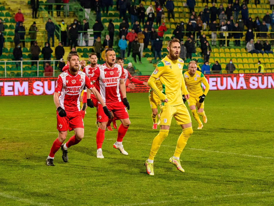 Gheorghe Bogdan Rusu si Marco Ehmann in meciul de fotbal dintre CS Mioveni si Dinamo Bucuresti, contand pentru Liga 1 Casa Pariurilor, desfasurat pe Stadionul Orasenesc din Mioveni, joi 16 decembrie 2021. © FOTO:Mihai Nitoiu/SPORT PICTURES
