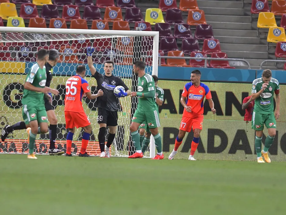 Andrei Daniel Vlad se bucura dupa un penalty aparat si executat de catre Bogdan Alexandru Mitrea sub privirile lui Tsvetelin Chunchucov in meciul de fotbal dintre FCSB si Sepsi OSK Sfantu Gheorghe, contand pentru Liga 1 Casa Pariurilor, desfasurat pe Arena Nationala din Bucuresti, luni 23 august 2021. © FOTO:Razvan Pasarica/SPORT PICTURES