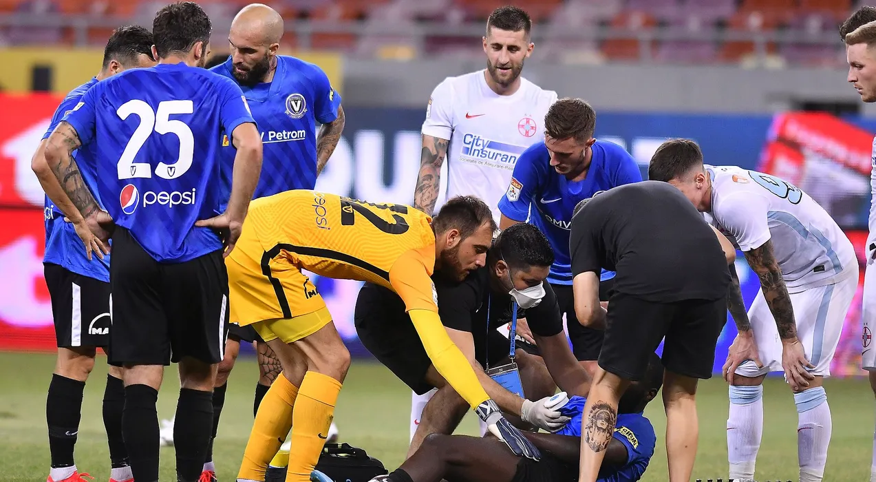 Angel Ortega Martinez, Valentin Alexandru Cojocaru si Carlo Roberto Casap alaturi de Kevin Luckassen accidentat aflat la pamantin meciul de fotbal dintre FCSB si FC Viitorul Constanta, contand pentru Liga 1 Casa Pariurilor, desfasurat fara spectatori pe Arena Nationala din Bucuresti, duminica 30 august 2020. © FOTO:Razvan Pasarica/SPORT PICTURES