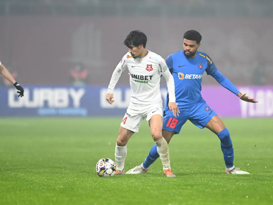 Mino Sota si Sylas Laouari Edjouma Malcom in meciul de fotbal dintre FC Hermannstadt si FCSB, contand pentru Superliga Superbet, desfasurat pe Stadionul Municipal din Sibiu, duminica 22 ianuarie 2023. © FOTO:Razvan Pasarica/SPORT PICTURES