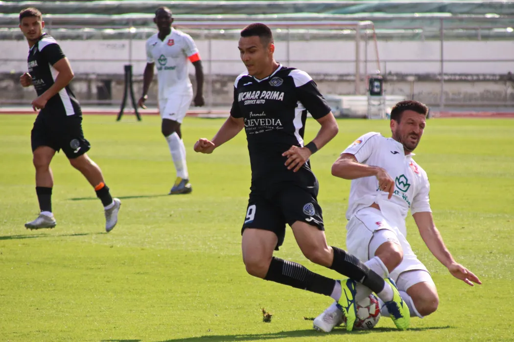 Razvan Dalbea (D) si Alexandru Buziuc (S) in meciul de fotbal dintre AFC Hermannstadt si Academica Clinceni, din etapa a 6-a a play-out-ului Ligii 1 casa Pariurilor, disputat pe stadionul Municipal din Sibiu, vineri, 26 iunie 2020. © FOTO:VALENTIN MACREA/ Sport Pictures