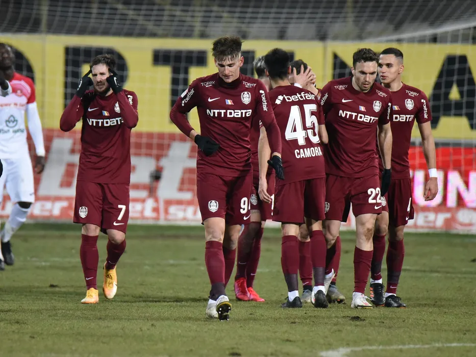 Bucurie a fotbalistilor de la CFR dupa un gol marcat cu Constantin Adrian Paun, Catalin Mihai Itu, Gabriel Debeljuh si Cristian Marian Manea in meciul de fotbal dintre FC Hermannstadt si CFR Cluj, contand pentru Liga 1 Casa Pariurilor, desfasurat fara spectatori pe Stadionul Municipal din Medias, luni 25 ianuarie 2021. © FOTO:Alexandru Veres/SPORT PICTURES