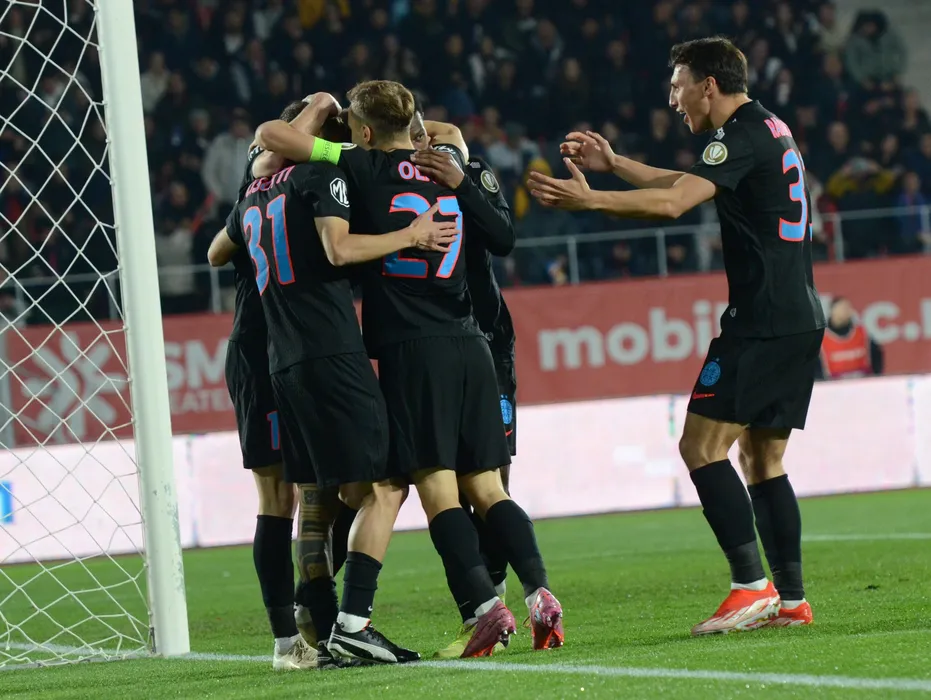 Fotbalistii ros-albastrii se bucura dupa un gol marcat in meciul de fotbal dintre AFC Hermannstadt Sibiu si FCSB, contand pentru Superliga Superbet, desfasurat pe Stadionul Municipal din Sibiu, duminica 9 noiembrie 2025. © FOTO:Alexandra Cristina Grigorescu/SPORT PICTURES