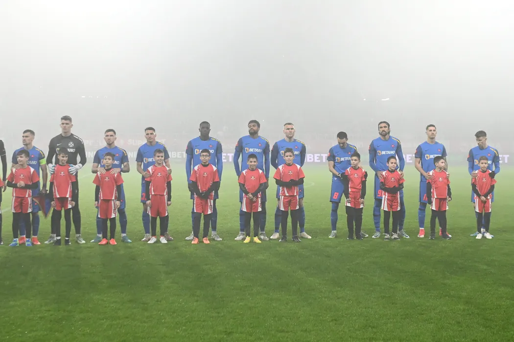 Fotbalistii stelisti la startul meciului de fotbal dintre FC Hermannstadt si FCSB, contand pentru Superliga Superbet, desfasurat pe Stadionul Municipal din Sibiu, duminica 22 ianuarie 2023. © FOTO:Razvan Pasarica/SPORT PICTURES